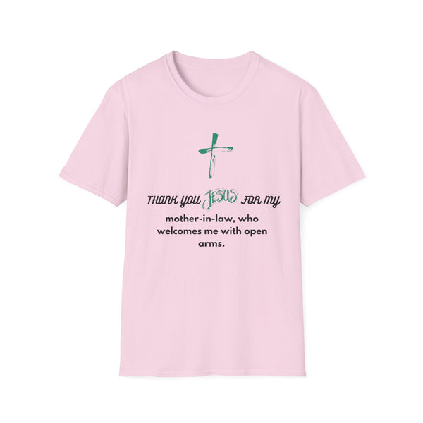 This unisex softstyle t-shirt radiates comfort and style, making it an essential addition to your wardrobe. Crafted from lightweight, durable 100% ring-spun cotton, it feels wonderful against the skin, offering a blissful wearing experience all year round. The classic fit and crew neckline make it versatile enough for both casual outings and semi-formal events. Perfect for expressing gratitude or appreciation, this shirt is ideal for those celebrating special moments with family or friends, particularly around holidays like Mother's Day or Christmas. It's a thoughtful gift for anyone looking to honor their loved ones, especially mothers and in-laws, by pairing heartfelt messages with cozy comfort.