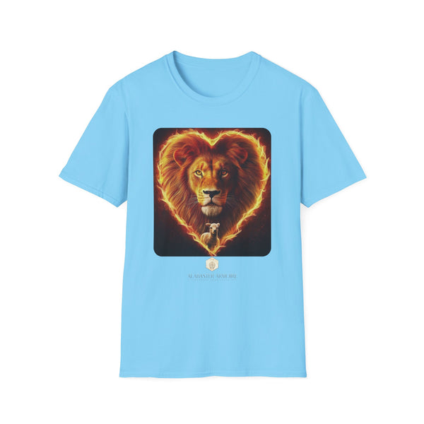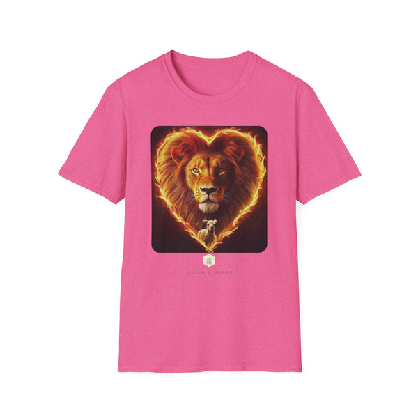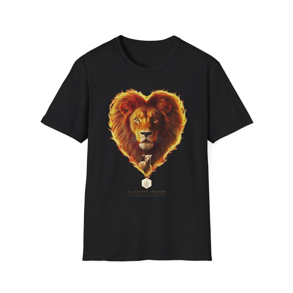 A Lion and the Lamb in a Heart design representing God and Jesus Christ, printed on a soft and durable unisex t-shirt. This shirt offers maximum comfort and a versatile style that can be worn for various occasions. Suitable for adults and perfect for those looking for religious-themed apparel. Ideal for gifting during religious holidays and celebrations.