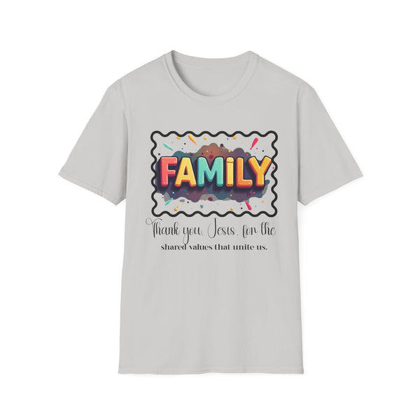 Colorful Family T-Shirt with the quote 'Thank you, Jesus, for shared values that unite us'. This unisex T-Shirt is made from 100% ring-spun cotton, ensuring a lightweight and comfortable wear. The classic fit and crew neckline make it versatile for any occasion.
