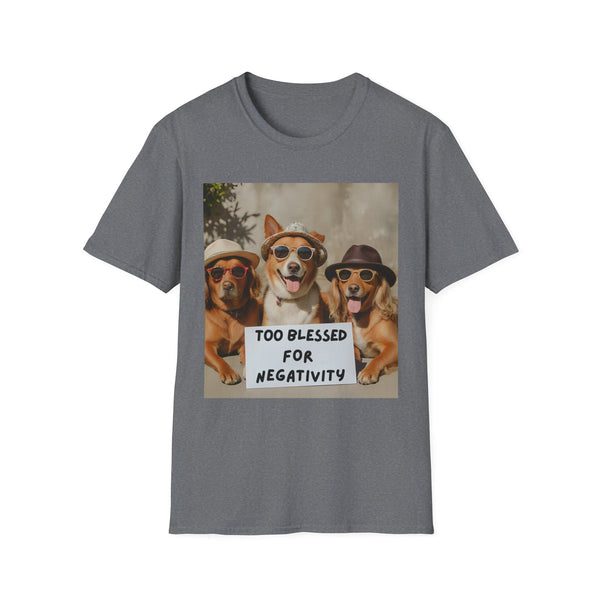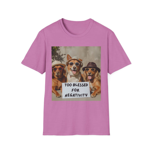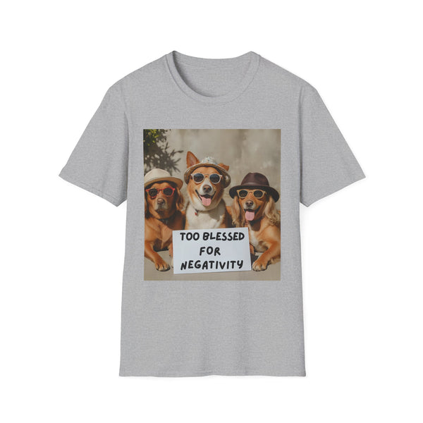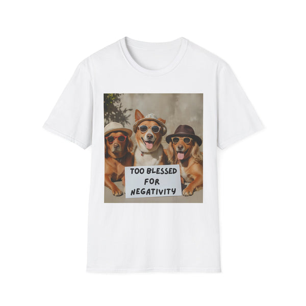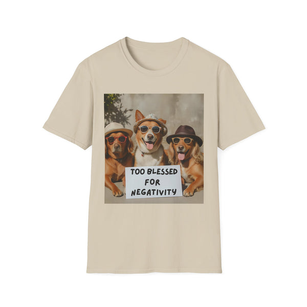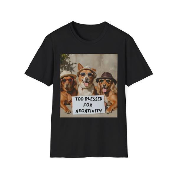 This trendy T-shirt features cool dogs with sunglasses and hats holding a sign that says "Too blessed for negativity". It exudes a fun and positive vibe, perfect for casual wear or lounging around. Ideal for dog lovers and anyone looking to spread positivity. Suitable for holidays, celebrations, and everyday wear.