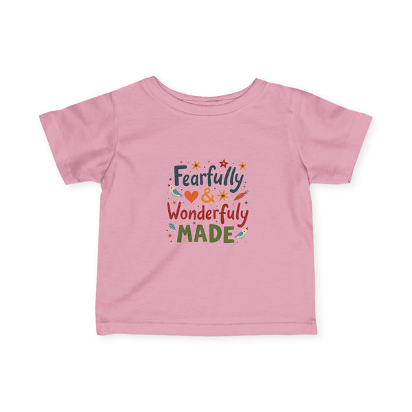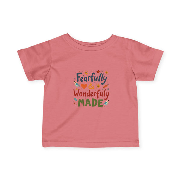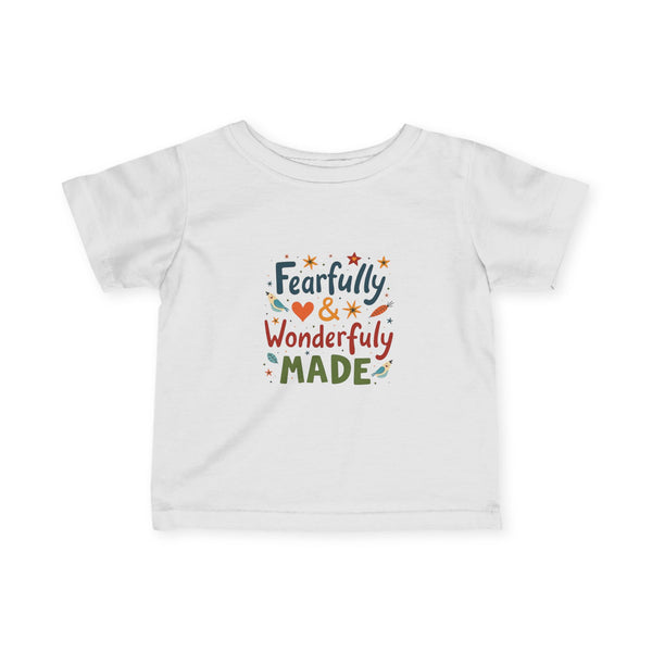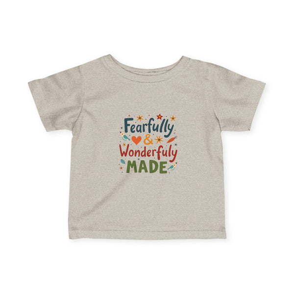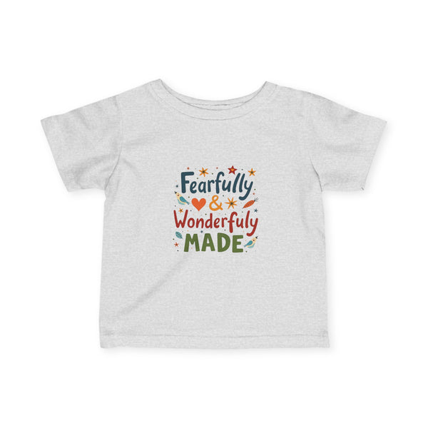 Soft, light, and sweet — this infant tee wraps tiny shoulders in gentle comfort while celebrating a little one’s unique spark. The playful hand-lettered design reads “Fearfully & Wonderfully Made” in warm, earthy tones with tiny stars and hearts, bringing a cozy, joyful feel to everyday wear. Breathable combed cotton and thoughtful construction (ribbed collar, shoulder tape, side seams) keep the shirt looking neat through washes and tumbles. It layers easily under sweaters or peeks out with overalls for family outings, quiet mornings at home, or first photo moments that deserve a tender, personal touch.