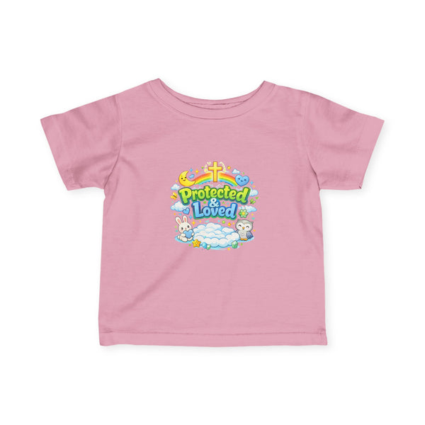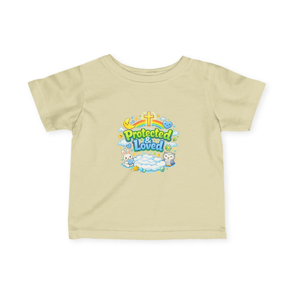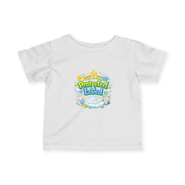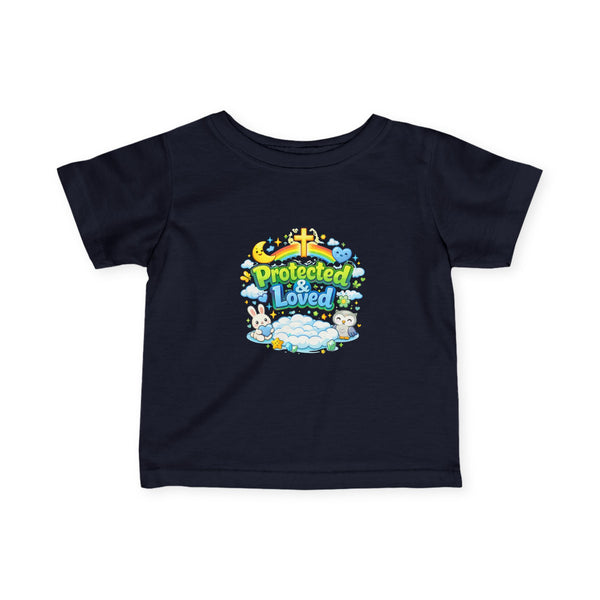 Soft, lightweight infant tee printed with a gentle, faith-based design that reads “Protected & Loved.” The artwork blends a warm golden cross, smiling clouds, and cuddly animals in pastel hues to create a calm, reassuring scene right on the chest. This shirt sits comfortably on little bodies without bulk, letting them move freely while keeping the print vibrant and clear. It’s suited for quiet family moments, church gatherings, baby dedications, or everyday wear when you want your baby to feel comforted and cozy.