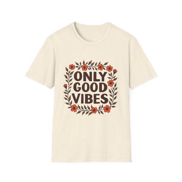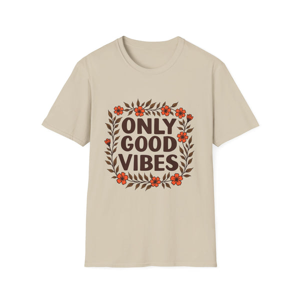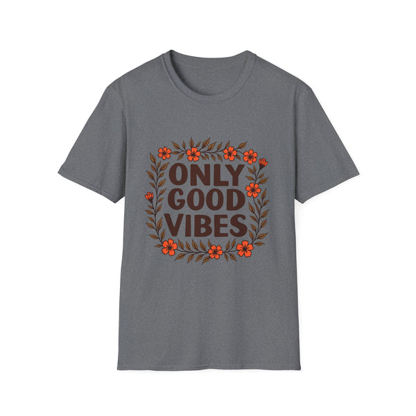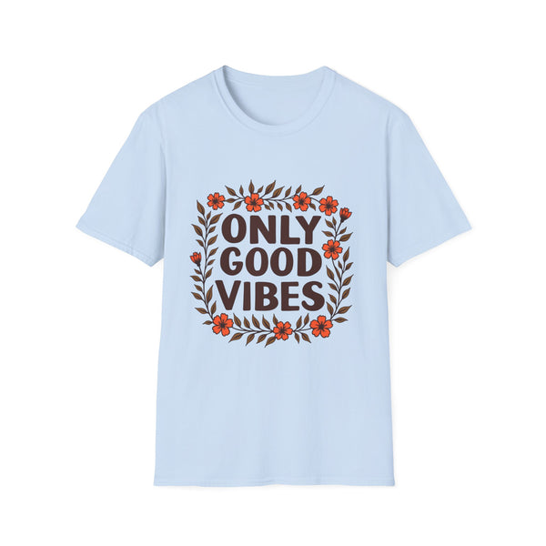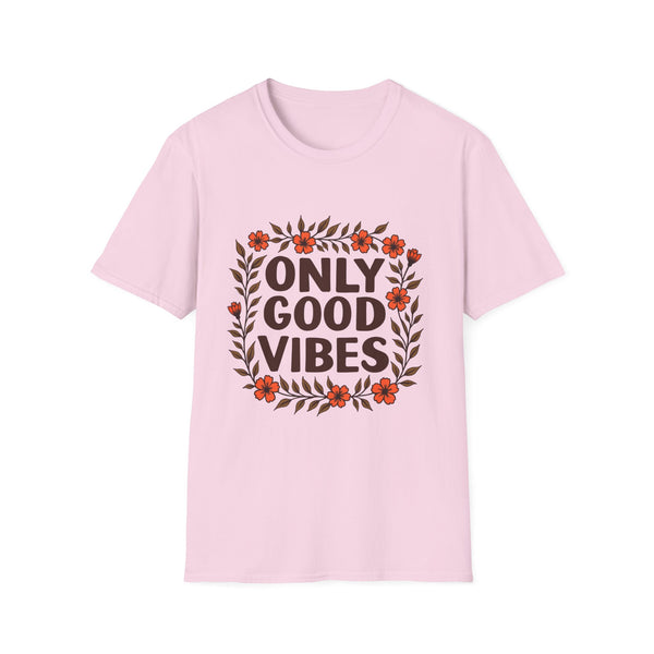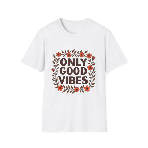 A unisex softstyle t-shirt featuring a graphic design with the phrase 'ONLY GOOD VIBES' surrounded by a floral arrangement. This t-shirt exudes positivity and good vibes, making it perfect for those who want to spread positivity in their everyday life. It's a great choice for casual wear and can be worn on various occasions. Ideal for adults looking for a comfortable and stylish t-shirt to express their positive outlook.